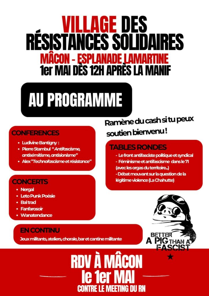 La manifestation partira à 10h de l’esplanade Lamartine, et sera suivie d’un village des résistances solidaires de 12h à 18h, avec restauration, buvette, concerts, fanfare, chorales, bal trad, jeux, espace enfants, stands associatifs, et une programmation riche de tables-rondes et conférences !